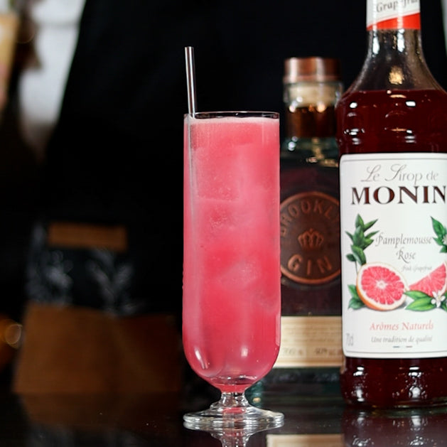 A riff of the classic cocktail Tom Collins with Monin Pink Grapefruit syrup served in a highball.